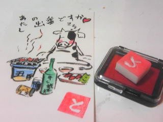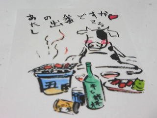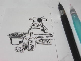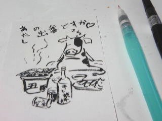 | これを描いているの が鼠年ということで、 今回のモチーフは 「丑」となります。 気ままに陽気な牛 を描き、絵図等が 完成したら、文字や 言葉、メッセージ等を 挿入します。 |