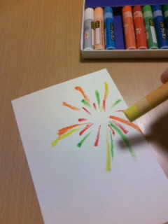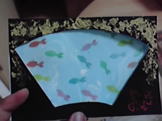 | 筆ペンと顔彩を もちいて着彩する。 消しゴムに自分 の名前の頭文字 を彫り判子とし、 画面上の好きな 部分に判を押した ら完成です。 |