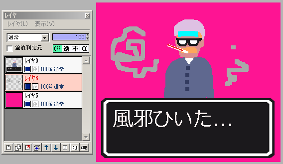 | LINEのスタンプをつくるにあたって、どうしても必要なのがレイヤ機能の付いたペイントソフト。 AzPainterはフリーソフトで個人的には使い勝手が非常に良いと感じているためここで紹介します。 レイヤ機能を使えば、パーツの組み合わせが大変楽で、ミスした際のリカバリが一瞬で済みます! 上の写真では、もともとレイヤ0しかない状態で、マスターの周辺になんか描き込みたいな〜って思って、 描き込みたい内容を描くためにレイヤ6を、描いた内容を見やすくするためにレイヤ5をひいています。 |