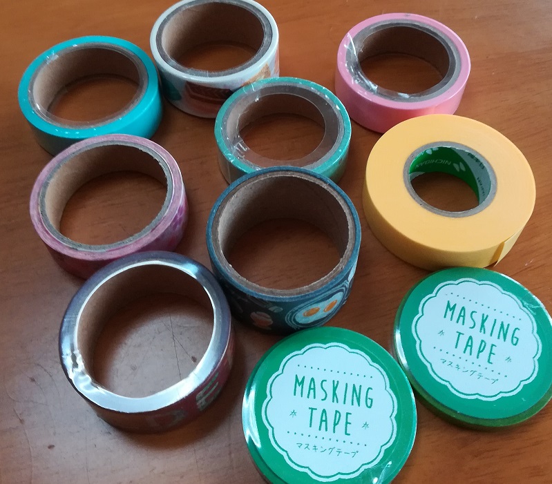 100円均一などで、太さや色の異なるマスキングテープを購入します。(左写真参考) 今回購入したセット: 寒色(水色・緑色・濃紺など) 暖色(桜・黄色・ブラウンなど) 自然物を描く場合はちぎればよいので太いテープだけでも問題ない。 (人工物をシャープなラインで描くには細いテープが欲しい) |