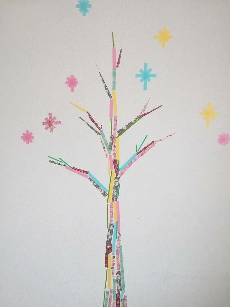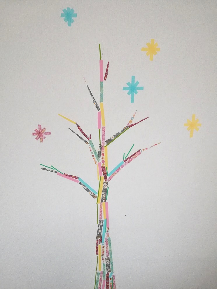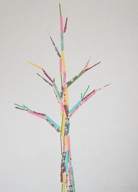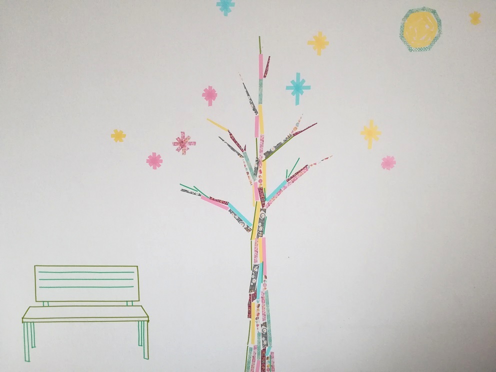 | 木を描きます。最初に幹となるラインを(テープは違う色で少しずつきって)一本ひきます。次に、下の方が太くなるようにテープを貼っていきます。 | ||