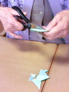 紋切り折り方ガイド に従って紙を折った 後、カッターやハサミ を使って紙を切り抜く。 |