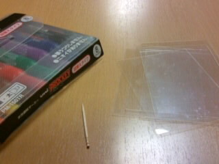 | 今回は、「海の中」を プラバンで表現して みることにします。 まずプラバンと色ペン を用意します。 |