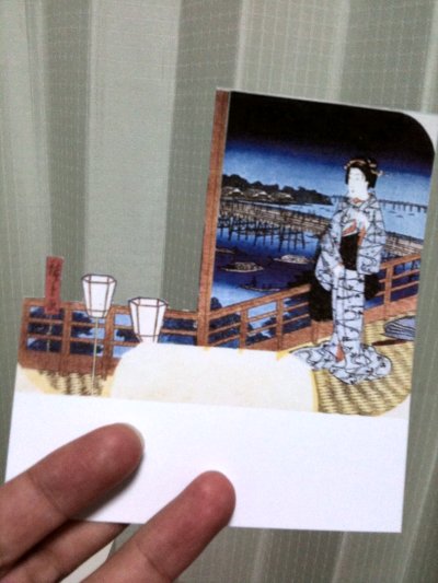 上の作品は『江戸名所見立三光 両国月之景』、歌川広重の作品をA4の厚紙に印刷して作成。