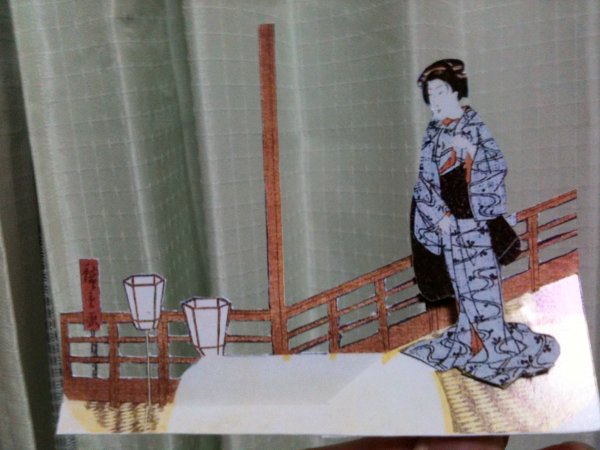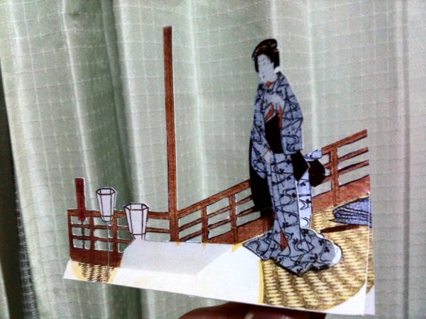 奥行きを感じさせるために4段階の平面を用意。 一、「提灯と桟」 二、「床」 三、「女性」 四、「背景」 |