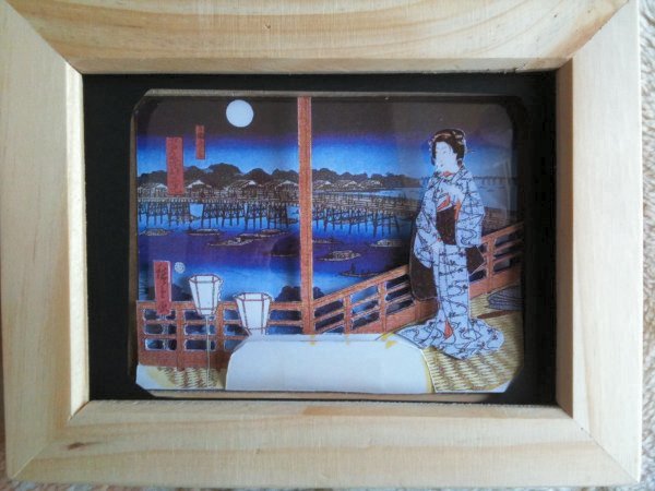 | 今回は歌川広重の作品『江戸名所見立三光 両国月之景』を シャドーボックスや立版古の中間っぽい立体絵画に仕上げてみることに。 |