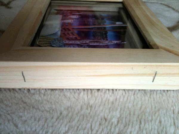 100円均一で購入した木製の額(上写真)2つはホッチキスでとめます。 後のメンテナンスが楽なのと、新しい絵に交換するのが簡単だからです。 |