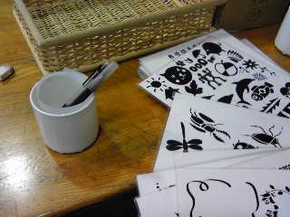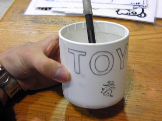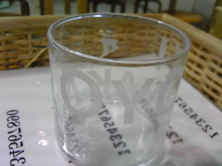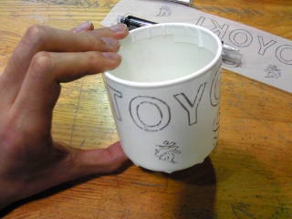 本ページでは、一般的なガラスの コップによるサンドブラスト作品 づくりを紹介します。 @コップの表面を厚手のビニール テープなどでマスキングする。 A表面に描くモチーフを決める。 |