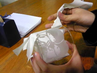C転写を終えたら、サンドブラスト 加工を施す部分のテープを、カッター などでくり抜く。 |